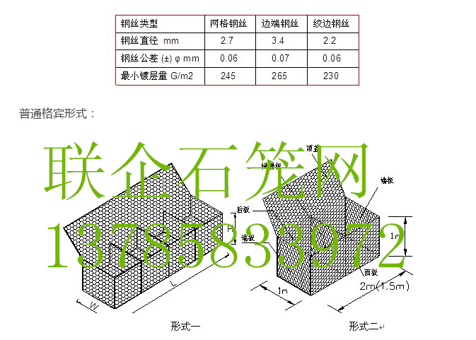 聯(lián)企石籠網(wǎng)是金屬線材編織的角形網(wǎng)(六角網(wǎng))制成的網(wǎng)箱,使用的金屬線徑是根據(jù)六角形的大小而不同。如果是金屬鍍層的金屬線六角形,則使用線徑為2.0mm到4.0mm的金屬線,如果是PVC包覆的金屬線編織的六角網(wǎng),則使用外徑為3.0mm到4.0mm的PVC(金屬)線.外框邊緣的線則使用比六角網(wǎng)線粗一號的線。