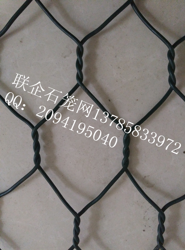 聯企格賓石籠由金屬絲制成的編織角網絡(六邊形),使用的金屬線徑是根據六角形金屬涂層金屬絲的大小,使用的網線直徑為2.0mm到4.0mm的金屬絲,六角網聚氯乙烯涂塑絲編織外徑為3.0mm到4.5毫米PVC(金屬)線。在框架的邊緣線比網絲線徑粗0.5mm。產品:石籠網,也被稱為大型六角形,或格賓網,由優質鋼絲擰網機的扭曲,編織。