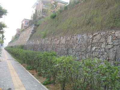 護坡石籠網的銜接應平整、均勻,接頭銜接規整、堅固。螺旋銜接線為與網箱相同材,質的覆樹脂膜鋼絲。單元網箱距離網與網身成90?相交,距離網與網身的四處交角各雙股綁扎一道,交接處選用連結線-孔繞-圈呈螺旋狀穿孔絞繞銜接。護坡石籠網綁扎時每隔15~20cm綁扎嵌固,中心進行八字拉結形成1mx1m較為規則的立方體護坡石籠網后沿施工線擺放。